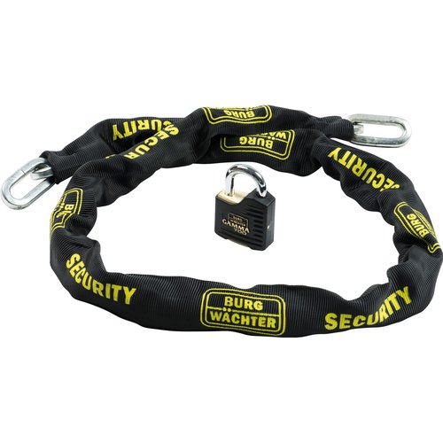 Das Burg-Wächter Kettenschloss-Set ermöglicht Ihnen die optimale Sicherung Ihres Fahrrads, Motorrads, Türen oder ähnlichem. Das Kettenschloss besteht aus einer stabilen, grobgliedrigen Metallkette und einem Burg-Wächter Gamma 700 Schloss. Beide Artikel sind in Schwarz gehalten und mit einem gelben Burg-Wächter Schriftzug versehen. Mit dieser Sicherung haben Sie einen zuverlässigen Schutz für Ihren Besitz. Produktdetails: - Farbe: Schwarz - Gewicht: 3,2 kg - Länge: 150 cm