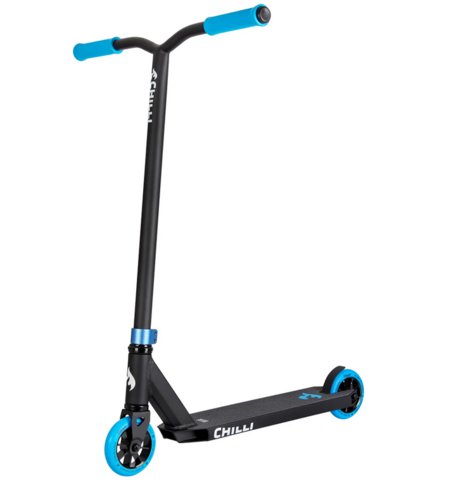 Das neue Chilli Pro Scooter Modell BASE ist der Einsteiger Stunt Scooter für jeden Beginner In diesem Preissegment unschlagbar, man bekommt die besten Materialien und kann direkt auch auf die Rampe. Der Base bietet jedem die Möglichkeit das Stuntscooter fahren auszuprobieren, ohne auf Qualität verzichten zu müssen. Das Deck ist aus bestem 6061 Aluminium, 50cm lang und 11,5cm breit. Dadurch hat man genug Platz um sich auf dem Deck zu bewegen und einen festen Stand zu haben. Die Lenkstange ist gefertigt aus 4130 ChrMo Stahl und 58cm hoch und 58cm breit. Die schöne Stahlgabel rundet das klassische Design des Scooters ab. Zur Kompression verwenden wir bei diesem Modell ein Universal HIC um Gewicht zu sparen. Das rundet auch die schöne HIC Aluminium 2 bolt Klemme ab. Als Steuerlager werden sealed loose ball Kugellager verwendet. Ansprechend ist auch die farbliche Abstimmung der Griffe mit dem Rollen PU. Die Rollen selber sind 110mm im Durchmesser und der Rollencore besteht ebenfalls aus bestem 6061 Aluminium. Die Flex-Bremse besteht aus Stahl und wird von oben montiert. Die Gesamthöhe des Scooter ist 79cm. Kauftipp: Die Bar sollte nicht deutlich über Bauchnabelhöhe gehen, wenn man auf dem Scooter steht. Level: Anfänger max. Belastung: 100kg Deck: 6061 Aluminium Deck Breite: 11,5cm Deck Länge: 50cm T-Bar: Stahl T-Bar Breite: 58cm T-Bar Länge: 58cm Gabel: Stahlgabel mit Universal HIC Clamp: 2-Bolt Aluminium Rollen: 110mm Bremse: Flex Brake Topmounted Kompression: Universal HIC mit sealed loose ball bearing Höhe Scooter: 79cm Gewicht: 3,5kg