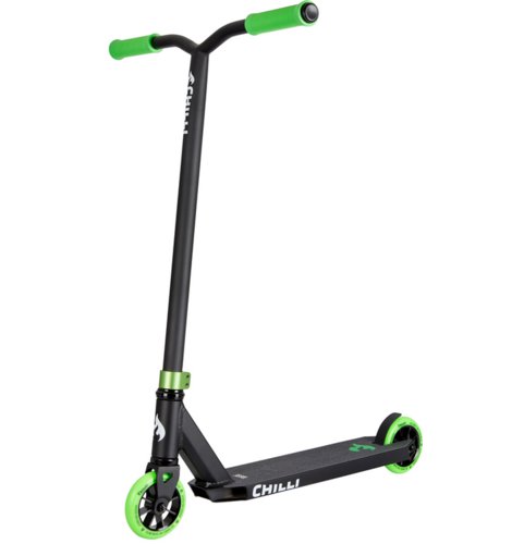 Das neue Chilli Pro Scooter Modell BASE ist der Einsteiger Stunt Scooter für jeden Beginner In diesem Preissegment unschlagbar, man bekommt die besten Materialien und kann direkt auch auf die Rampe. Der Base bietet jedem die Möglichkeit das Stuntscooter fahren auszuprobieren, ohne auf Qualität verzichten zu müssen. Das Deck ist aus bestem 6061 Aluminium, 50cm lang und 11,5cm breit. Dadurch hat man genug Platz um sich auf dem Deck zu bewegen und einen festen Stand zu haben. Die Lenkstange ist gefertigt aus 4130 ChrMo Stahl und 58cm hoch und 58cm breit. Die schöne Stahlgabel rundet das klassische Design des Scooters ab. Zur Kompression verwenden wir bei diesem Modell ein Universal HIC um Gewicht zu sparen. Das rundet auch die schöne HIC Aluminium 2 bolt Klemme ab. Als Steuerlager werden sealed loose ball Kugellager verwendet. Ansprechend ist auch die farbliche Abstimmung der Griffe mit dem Rollen PU. Die Rollen selber sind 110mm im Durchmesser und der Rollencore besteht ebenfalls aus bestem 6061 Aluminium. Die Flex-Bremse besteht aus Stahl und wird von oben montiert. Die Gesamthöhe des Scooter ist 79cm. Kauftipp: Die Bar sollte nicht deutlich über Bauchnabelhöhe gehen, wenn man auf dem Scooter steht. Level: Anfänger max. Belastung: 100kg Deck: 6061 Aluminium Deck Breite: 11,5cm Deck Länge: 50cm T-Bar: Stahl T-Bar Breite: 58cm T-Bar Länge: 58cm Gabel: Stahlgabel mit Universal HIC Clamp: 2-Bolt Aluminium Rollen: 110mm Bremse: Flex Brake Topmounted Kompression: Universal HIC mit sealed loose ball bearing Höhe Scooter: 79cm Gewicht: 3,5kg