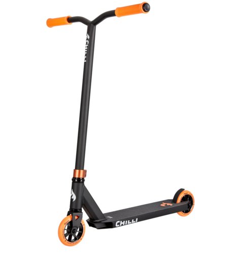 Das neue Chilli Pro Scooter Modell BASE ist der Einsteiger Stunt Scooter für jeden Beginner In diesem Preissegment unschlagbar, man bekommt die besten Materialien und kann direkt auch auf die Rampe. Der Base bietet jedem die Möglichkeit das Stuntscooter fahren auszuprobieren, ohne auf Qualität verzichten zu müssen. Das Deck ist aus bestem 6061 Aluminium, 50cm lang und 11,5cm breit. Dadurch hat man genug Platz um sich auf dem Deck zu bewegen und einen festen Stand zu haben. Die Lenkstange ist gefertigt aus 4130 ChrMo Stahl und 58cm hoch und 58cm breit. Die schöne Stahlgabel rundet das klassische Design des Scooters ab. Zur Kompression verwenden wir bei diesem Modell ein Universal HIC um Gewicht zu sparen. Das rundet auch die schöne HIC Aluminium 2 bolt Klemme ab. Als Steuerlager werden sealed loose ball Kugellager verwendet. Ansprechend ist auch die farbliche Abstimmung der Griffe mit dem Rollen PU. Die Rollen selber sind 110mm im Durchmesser und der Rollencore besteht ebenfalls aus bestem 6061 Aluminium. Die Flex-Bremse besteht aus Stahl und wird von oben montiert. Die Gesamthöhe des Scooter ist 79cm. Kauftipp: Die Bar sollte nicht deutlich über Bauchnabelhöhe gehen, wenn man auf dem Scooter steht. Level: Anfänger max. Belastung: 100kg Deck: 6061 Aluminium Deck Breite: 11,5cm Deck Länge: 50cm T-Bar: Stahl T-Bar Breite: 58cm T-Bar Länge: 58cm Gabel: Stahlgabel mit Universal HIC Clamp: 2-Bolt Aluminium Rollen: 110mm Bremse: Flex Brake Topmounted Kompression: Universal HIC mit sealed loose ball bearing Höhe Scooter: 79cm Gewicht: 3,5kg