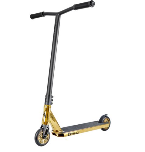 Ein super Allround-Einsteiger Stunt Scooter mit unschlagbarem Preis- /Leistungsverhältnis. Der Reaper ist enorm robust und dabei trotzdem noch leicht genug um alle erdenklichen Tricks damit zu machen. Im Austausch einer erweiterten Brake, kann der Reaper auch mit 120mm Wheels gefahren werden. Um es für euch noch bequemer zu machen, kommt der Reaper vormontiert. Ihr müsst lediglich die Bar noch auf das Deck schrauben. Die Gesamthöhe beträgt in fertig aufgebautem Zustand 84cm. Den Reaper gibt es auch noch in weiteren Farben oder stelle ihn dir individuell mit unseren Parts zusammen und mach ihn zu deinem individuellen Reaper. Tipp für den Kauf: Die Bar sollte nicht deutlich über Bauchnabelhöhe gehen, wenn man auf dem Scooter steht. Level: Anfänger und Fortgeschrittene max. Belastung: 100kg Deck: 6061 Aluminium Deck Breite: 11,5cm Deck Länge: 50cm T-Bar: Stahl T-Bar Breite: 58cm T-Bar Länge: 58cm Gabel: 7003 Slim Cut Aluminium Clamp: 3-Bolt Aluminium Rollen: 110mm Bremse: Flex Brake Topmounted Kompression: Chilli Spider HIC Höhe Scooter: ca. 84cm Gewicht: 3,8kg