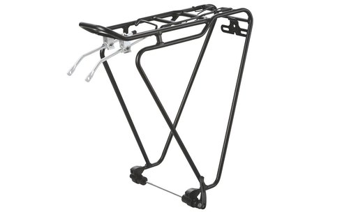Scheibenbrems Gepäckträger Comus 29 Zoll An Rädern mit Scheibenbremsen lassen sich die meisten Gepäckträger nicht ohne Zubehör montieren. Dieser Gepäckträger löst dieses Problem auf elegante Weise. Seine Rohrgeometrie umgreift den Bereich der Scheibenbremse rückwärtig, wodurch der Träger in Fußbreite schmal und stabil bleibt. Er lässt sich mittels mitgeliefertem Schnellspanner an der Nabe montieren.