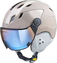 Skihelm Corao+ Cashmere von CP mit leichter, stoßsicherer Carbonschale und wärmendem Innenleben aus Kaschmirmaterial.Das einzigartige, polarisierte Visier mindert die blendenden Reflexionen und ermöglicht ein ermüdungsfreieres Sehen und entspanntes SkiFahren. Das innovative Vario-Glas verdunkelt bei zunehmender Helligkeit und wirkt kontrastverstärkend.