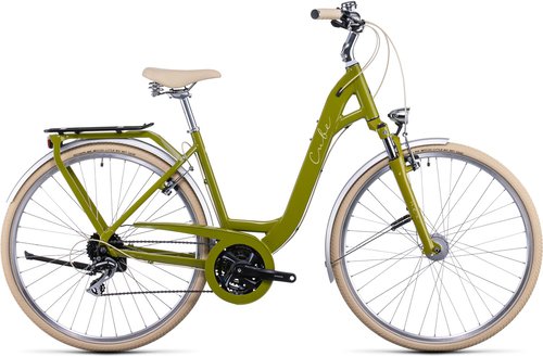Cube Ella Ride avocado´n´cream Easy Entry - City & Tour On-Road Bike: Was praktisch und funktionell daherkommt, muss nicht gleich langweilig oder gar haesslich sein. Der beste Beweis dafuer ist das Ella Ride: Sein unglaublich schicker Retro-Look ist nur eines der Highlights dieses Bikes, zusaetzlich haben wir eine komfortable Federgabel verbaut, die Unebenheiten und Ruckler vom Untergrund geschmeidig abfaengt, und eine einfach zu bedienende, breit gefaecherte Shimano Schaltung mit 3x8 Gaengen, die fuer die optimale Abstimmung im Vorwaerts sorgt. Was noch? Dank der LED Beleuchtungsanlage wird man unterwegs immer optimal gesehen, ein elegant in das Design uebergehender Gepaecktraeger, Schutzbleche und ein Seitenstaender geben dem Ella Ride seine Vielseitigkeit und Alltagstauglichkeit. Rahmen: Was beim Ella als Erstes auffaellt und begeistert, ist seine schoene Optik - doch dieser Tiefeinsteiger hat noch viel mehr zu bieten. Das Chassis ist leicht, komfortabel und stylisch, ausserdem hat es wie alle unsere Rahmen unsere umfassenden hauseigenen Tests zu Stabilitaet und Sicherheit mit wehenden Fahnen bestanden. Fuer die optimale Sitzposition und damit hohen Fahrkomfort auf allen moeglichen Touren sorgt die Efficient Comfort Geometry - und auf dem elegant und formschoen ins Design integrierten Gepaecktraeger findet alles Platz, was unterwegs unbedingt mit muss. Ein weiteres Highlight: Alle Komponenten sind farblich perfekt aufeinander abgestimmt - warum auch nicht?!