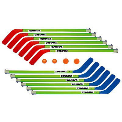 Dom Hockeyschläger-Set Junior: Bieten viele Vorteile für Sie - Das Dom Hockeyschläger-Set Junior ist ein äußerst flexibles und robustes Schläger-Set für Kinder. Bei der Entwicklung dieser neuen Hockeyschläger stand die Sicherheit im Vordergrund. Einsetzbar sind die Hockey-Geräte für Streethockey, Eishockey und Hallenhockey. Die Schläger hinterlassen zudem keine Streifen am Hallenboden, sind für Rechts- und Linksschuss geeignet, unzerbrechlich und im In- und Outdoorbereich bestens einsetzbar. - Produktdetails: - Schaftlänge: ca. 92 cm (= 36) - Profil (LXB): ca. 2,7x1,9 cm - Gewicht pro Schläger: ca. 380 g - Schaft aus hochwertigem Polyäthylen - Mit 2 parallel verlaufenden Querrippen zur Innenverstärkung - Gerader Fuß aus robustem Polyäthylen - Schaft und Fuß sind 2-fach verschraubt - Das Set besteht aus: - 6 Hockeyschlägern Junior, Blau - 6 Hockeyschlägern Junior, Rot - 2 Hockeybällen, ø ca. 6,7 cm, Orange - 2 Super-Pucks, ø ca. 10 cm, Orange - Vorteile: - Fuß hinterlässt keine Streifen am Hallenboden - Für Links- und Rechtsschuss geeignet - Extrem stabil und langlebig - Unzerbrechlich - Geeignet für Innen- und Außeneinsatz