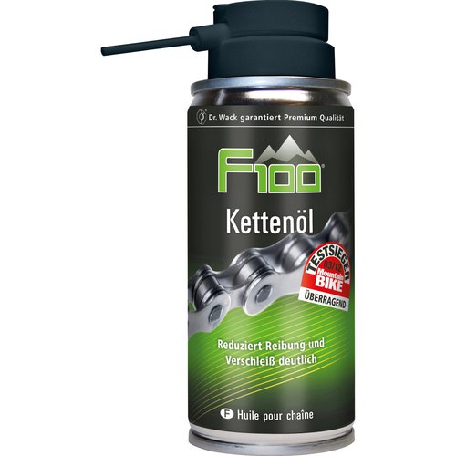 Das F100 Kettenöl ist für die Pflege aller zu schmierenden Teile am Fahrrad, z.B. Kette, Federgabel, Dämpfer, Bowdenzüge geeignet. Es verringert deutlich die Reibung und ermöglicht dadurch ein sehr ruhiges Laufverhalten, sowie eine längere Lebensdauer der behandelten Teile Dank der hervorragenden Kriecheigenschaft werden auch schwer zugängliche Stellen erreicht und erhalten einen umfassenden Korrosions- und Verschleißschutz. Dieses Pflegemittel verfügt über eine lange Haftwirkung und erhält die Wirkung auch bei starken Belastungen und Regenfahrten.
