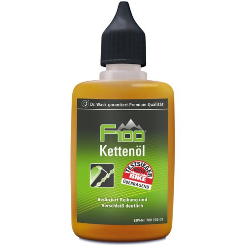 Das F100 Kettenöl ist für die Pflege aller zu schmierenden Teile am Fahrrad, z.B. Kette, Federgabel, Dämpfer, Bowdenzüge geeignet. Es verringert deutlich die Reibung und ermöglicht dadurch ein sehr ruhiges Laufverhalten, sowie eine längere Lebensdauer der behandelten Teile Dank der hervorragenden Kriecheigenschaft werden auch schwer zugängliche Stellen erreicht und erhalten einen umfassenden Korrosions- und Verschleißschutz. Dieses Pflegemittel verfügt über eine lange Haftwirkung und erhält die Wirkung auch bei starken Belastungen und Regenfahrten.