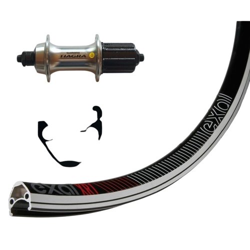 Felge: 700 C Exal XR1, 32 Loch, Alu, schwarz. ETRTO 622-13, ohne Ösen.Ventil 6,5mm.Nabe: AR Tiagra Kassette, 8/9 Gänge, silber.Abstand 130mm.Speichen aus Edelstahl mit doppelter Stärke.Blockierung rapide, sin palanca.