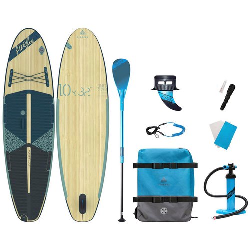 SUP-Set mit aufblasbarem Allround-Board in Dropstitch-Konstruktion; verstärkte Sidestringers; Fixierung für 1 Kajaksitz und Dry Bags; 1 abnehmbare Smartfin aus recycelten Fischernetzen; 1 Teleskop-Paddel; 1 Doppelhubpumpe; Reparatur-Kit; Gepäcknetz; Leash; inkl. Packsack mit Rucksackträgern; max. belastbar bis 120 kg.