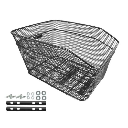 Schwarzer Korb mit dichten Drahtgeflecht zum befestigen an den Gepäckträger Länge: 410 mm x Breite: 340 mm x Höhe: 250 mm einschließlich Halterung Material: Fe-Stahl Gewicht: 1210 g