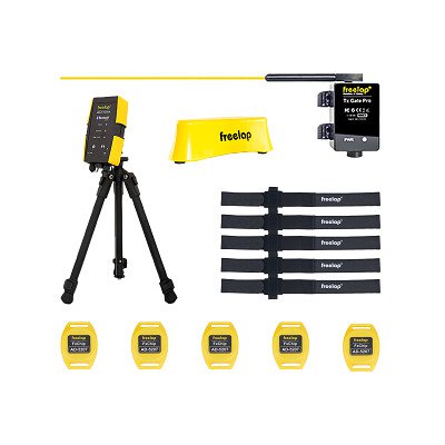 So funktioniert das Freelap Zeitmesssystem-Set Alpin Ski Pro - Am Start der Strecke platzieren Sie ein TX Gate Pro. Dieser Startsender ist mit einem Stab ausgestattet, welcher den Auslösezeitpunkt bei Berührung des Stabes sehr genau bestimmt. Der Skifahrer befestigt einen Freelap Fx Chip mit dem FxSki Gurt an einem der Skischuhe. Am Ende der Strecke wird ein TX Track Pro platziert, welches den Sportler beim Eintreffen in das Ziel erfasst. Der Chip dient als Transponder und sendet die Daten an den Relay Coach BLE. Dieser überträgt die Daten dann per Bluetooth an das Endgerät, wie z. B. ein Smartphone mit der kostenlosen MyFreelap App. - Set-Bestandteile: - 1 Freelap TX Gate Pro - 1 Freelap Relay Coach BLE - 1 Freelap TX Track Pro - 5 Freelap FX Chip - 5 Freelap Gurt FxSki - Produktdetails: - Freelap TX Gate Pro - Inkl. Gurten zur Befestigung am Pfosten - Pfosten nicht im Lieferumfang enthalten - Der Sender sollte in Schienbeinhöhe parallel zum Boden platziert sein - Der Schnee-zu-Startsender-Abstand sollte zwischen 35 und 50 cm betragen - Kompatibilität: FxChip/FxChip BLE - Sender mit 1 Code: Start - Genauigkeit: 1/100 Sekunde - Erfassungsfeld: 1,5 m - Batterien: 2 LR6 (AA) - Lebenszyklus: 15.000 Abfahrten - Wasserdichtigkeit: 3 ATM - Betriebstemperaturen: -20 °C bis +50 °C - Material: Fiberglas-Stab, Kunststoff - Maße (LxBxH): 60x70x125 mm - Gewicht: 320 g - Freelap Relay Coach BLE - Kompatibilität: FxChip, LED-Anzeige - Technologie: Bluetooth (BLE) - Bluetooth-Erfassungsabstand: bis zu 50 m (abhängig vom mobilen Gerät) - Speicher: 6.000 LAPs - Batterie: 3.7 V 5 Ah LiPo, automatische Abschaltfunktion bei Nichtgebrauch + Low Battery Anzeige, einfaches Aufladen mit einem USB-Kabel - Ladezeit: 10 Stunden - Akkulaufzeit: 80 Stunden - Wasserdichtigkeit: 3 ATM - Betriebstemperaturen: -20 °C bis +50 °C - Material: Kunststoff - Maße (LxBxH): 155x95x35 mm - Gewicht: 270 g - Freelap TX Track Pro - Kompatibilität: FxChip, FxChip BLE - Sender mit 3 Codes: Start, Lap, Finish - Erfassungsfeld: 3,5 m auf jeder Seite - Genauigkeit: 2/100 Sekunde - Mindestabstand zwischen 2 Sendern: 10 m - Batterie: 3.7 V 5 Ah LiPo + Ladeanzeige, und automatische Abschaltfunktion nach 12 Std. (Ladezeit 10 Std.) - Akkulaufzeit: 50 Std. - Wasserdichtigkeit: 3 ATM - Betriebstemperaturen: -20 °C bis +50 °C - Material: Kunststoff - Maße (LxBxH): 55x115x195 mm - Gewicht: 400 g