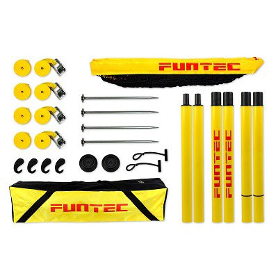 Funtec Beachvolleyballanlage Beach Champ: Mit Kevlarspannseil - Die Funtec Beachvolleyballanlage Beach Champ ist durch das Stecksystem der Pfosten transportabel und leicht auf- und abzubauen. Sie sind zudem mit einem höhenverstellbaren Fußteil ausgestattet. Mittels der einsetzbaren 19 cm langen Aluminium-Fußstücke können Sie die Netze auf 2 verschiedene Höhen einstellen. Für die beim Beachtennis erforderliche Netzhöhe von 170 cm verwenden Sie einfach je Seite einen 84 cm langen Pfosten und kombinieren diesen mit den 19 cm langen Aluminium-Adaptern. - Schnell aufgebaut mit stabilem Stand - Durch elastische Bungees ist eine nachträgliche Netzzentrierung nicht mehr nötig. Dank des Abspannsystems können die unteren Spannleinen direkt zu den Spanngurten geführt werden. Vorteil: Der Pfosten steht noch stabiler und die Netzspannung wird optimiert. - Set-Bestandteile: - 2 Pfosten mit höhenverstellbaren Fußteilen - 1 Netz - 2 Netzzentrierungen - 4 2-teilige Spanngurte mit Klemmschlössern - 4 Erdnägel - 1 Transporttasche - Lieferung ohne Spielfeldmarkierung - Produktdetails Netzpfosten: - Material: Kunststoff - Maße (Lxø): 84x7,5 cm (4x), 64x7,5 cm (2x) - Mit höhenverstellbarem Fußteil: 19x7,5 cm (2x) - Produktdetails Netz: - Maße (LxB): 85x100 cm - Maschenweite: 10 cm - L (Erdnägel): 45 cm - Auf 2 Höhen einstellbar: 2,24/2,43 m - Produktdetails Tasche: - Material: Polyester - Maße (LxBxH): 100x30x30 cm - Mit Tragegurten und Reißverschluss