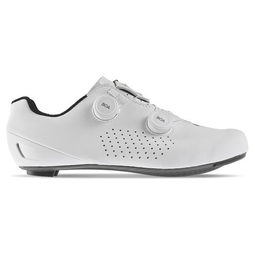 Übersetzung ins Deutsche:Vorstellung des CARBON G.FUGA Rennradschuhs, zeitloser Stil trifft auf hochleistungsfähige Funktionalität. Sorgfältig gefertigt für ein verbessertes Fahrerlebnis mit raffinierten Materialien und modernster Technologie.Das Mikrofasermaterial ist strategisch perforiert, um die Atmungsaktivität zu priorisieren und die Belüftung zu verbessern, sodass Ihre Füße während der gesamten Fahrt kühl und trocken bleiben. Im Inneren ist der Schuh mit Mesh kombiniert, um eine lang anhaltende Fußunterstützung zu gewährleisten und die Stabilität zu erhöhen.Das DUAL FITTING CLOSURE SYSTEM mit zwei unabhängigen BOA Dial Z-Drehverschlüssen bietet maßgeschneiderte Passformanpassungen sowohl für den Spann- als auch für den Vorfußbereich und sorgt so für einen präzisen, schnellen und individuellen Verschluss ohne Druckpunkte. Der L6 DIAL Z, bekannt für sein hochwertiges aerodynamisches Design, verfügt über eine optimierte gummierte Oberfläche für einen effektiven und sicheren Halt. Die FIT TONGUE 1.0 ist nahtlos konstruiert und verfügt über eine High-Tech-Polsterschicht für verbesserten Komfort und Atmungsaktivität.Die integrierte rutschfeste Fersenschale mit interner Anti-Rutsch-Behandlung verbessert die Fußstabilität und -kontrolle für ein verbessertes Fahrerlebnis. EPS TRANSPIRANT INSOLE mit anatomischer Unterstützung für Komfort und Pedaliereffizienz.Die GAERNE ´´EPS LIGHT WEIGHT FULL CARBON SOLE 10.0´´ sorgt sowohl für Leichtigkeit als auch Steifigkeit und maximiert die Kraftübertragung durch ihre ultradünne Carbonkonstruktion. Zwei Kanäle an der Sohle optimieren die Fußbelüftung während des Gebrauchs. Rutschfeste Gummieinsätze an der Vorder- und Rückseite sorgen für sicheres Gehen, wobei der hintere Einsatz austauschbar ist. Die Sohle ist mit allen Klickpedalen kompatibel und verfügt über einen Steifigkeitsindex von 10.