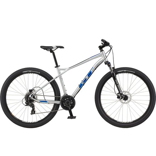 GT Aggressor Expert 650B Mountainbike Hardtail MTB Fahrrad 27,5" Mountain Bike Das GT Aggressor Expert Hardtail Mountainbike kommt auch 2021 in einer frisch überarbeiteten Version mit neuen Farben wieder. Das 650B bzw. 27,5 Zoll Bike ist dein zuverlässiger Begleiter im Alltag, auf Wochenendtouren und im Gelände. Der Aluminiumrahmen besitzt das GT Triple Triangle Design, das dank bester Balance und Verwindungssteifigkeit für ein ausgewogenes Fahrgefühl sorgt. Das Material selbst ist leicht und robust und kann so einiges ab. Der Rahmen unterstützt eine moderat sportliche Sitzposition, die durch den breiten, leicht gekröpften Lenker positiv beeinflusst wird. Flexende Sitzstreben fangen Vibrationen des Untergrunds ab und verbessern dein Sitzgefühl immens. Zusätzlich bietet die SR Suntour Federgabel 80 mm Federweg, mit denen sie Stöße abmildert. Mit 24 Gängen bietet dir dieses MTB eine feine Gangabstufung an, mit der du deine Übersetzung an jede Geländeanforderung genau anpassen kannst. Schaltwerk Tourney und Umwerfer stammen vom Hersteller Shimano und stehen für Langlebigkeit und Robustheit. Einmal richtig eingestellt, liefern die Komponenten zuverlässig und wartungsarm ihre Leistung. Mit den hydraulischen Scheibenbremsen von Tektro bist du auf dem Aggressor Expert jederzeit in der Lage, dein Bike präzise zu kontrollieren. Scheibenbremsen liefern auch bei Nässe und Verschmutzung unbeeindruckt ihre kräftige Bremsperformance und sind daher genau richtig am Mountainbike. Für den passenden Bodenkontakt sorgen die WTB Ranger Comp Reifen mit ihrem griffigen DNA-Compound und den passend für den Offroad-Einsatz angeordneten Stollen, die überall besten Halt finden. Die 2,25 Zoll breiten Reifen kommen auch mit ebenen, asphaltierten Straßen bestens klar. Sie sitzen auf Aluminium Doublewallfelgen, die ebenfalls von WTB stammen und hinsichtlich Gewicht und Verwindungssteife auf die Anforderungen des Mountainbikens bestens vorbereitet sind. Mit Laufradgröße 27,5 Zoll bist du mit hoher Laufruhe und bestem Überrollverhalten bei hoher Agilität unterwegs. Optisch eignen sie sich hervorragend für nicht ganz so große Fahrer, die alle Vorteile großer Laufräder nutzen wollen. Wir empfehlen das GT Aggressor Expert für Fahrer zwischen 160 cm und 180 cm Körpergröße. Aus drei Rahmenhöhen kannst du die auswählen, die am besten zu dir passt. Damit es ohne lange Bastelei gleich losgehen kann, werden alle Fahrräder bereits zu mindestens 85 % vormontiert ausgeliefert. Achtung: Wir weisen darauf hin, dass dieses Fahrrad nicht mit Beleuchtung ausgestattet und damit nicht StVZO-konform ist. Es wird empfohlen, eine entsprechende Nachrüstung vorzunehmen. Technische Daten: Hersteller: GT Modell: Aggressor Expert Farbe: satin slate blue/blue/orange, gloss silver/team blue/black Gänge: 24 Rahmengröße: 38 cm, 42 cm, 46 cm Laufradgröße: 650B/27,5 Zoll Rahmen: GT Triple Triangle Aluminium Sloping-Rahmen mit flexenden Sitzstreben Gabel: SR Suntour XCM-DS Federgabel mit 80 mm Federweg, hydraulischem Lockout und einstellbarer Vorspannung Steuersatz: halbintegriert, abgedichtet Vorbau: GT All Terra Aluminium, Durchmesser: 31,8 mm, Winkel: 8° Lenker: GT All Terra Aluminium Riser Bar, Breite: 720 mm, Rise: 25 mm, Sweep: 8° Griffe: GT Statement Schalthebel: Shimano SL-M315 Schalthebel Bremshebel: Tektro Aluminium Dreifingertyp Schaltwerk: Shimano Tourney 8-fach Umwerfer: Shimano FD-TY700 3-fach Kurbelgarnitur: Shimano FC-TY301 dreifach, 42-34-24 Zähne Kassette: Shimano Acera 8-fach, 12-32 Zähne Kette: KMC Z 8.3 Innenlager: cartridge Vierkant Bremsen: Tektro HD-M275 160/160 mm hydraulische Scheibenbremsen Reifen: WTB Ranger Comp 27,5" x 2,25" DNA-Compound Felgen: WTB SX19, 32 Loch Naben: Aluminium Speichen: 14G, rostfreier Stahl, 32 Stück Pedale: GT Slim Line Plattformpedale Sattel: GT MTB Sattelstütze: GT All Terra Aluminium Patentsattelstütze empfohlene Körpergröße: RH 38: 160 - 170 cm RH 42: 165 - 175 cm RH 46: 170 - 180 cm zulässiges Gesamtgewicht: 120 kg Gewicht: 15 kg Lieferzustand: 85 % vormontiert Lieferumfang: 1 Fahrrad, Zubehör (Reflektoren, Glocke)
