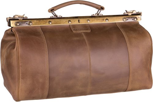 Besonderes Taschenmodell von Harold's: Arzttasche mit großem Bügelverschluss. Ist abschließbar und aus offenporigem, gewachstem und geöltem Rindleder. Mit Tragegriff und Schultergurt. Maße: 44x30x21 cm.