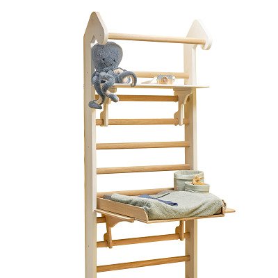 Heimholz Sprossenwand Baby Das Set, das mitwächst - Die Sprossenwand Baby aus dem Hause Heimholz ist mehr als nur eine Sprossenwand. Dank praktischem Zubehör funktionieren Sie das Fitnessgerät zum Wickeltisch oder Schreibtisch um. Hängen Sie lediglich die Tischauflage auf der gewünschten Höhe der Sprossen ein. Aber auch zum Laufen lernen bietet sich diese einzigartige Sprossenwand an. Dank abgerundeter Kanten und Ecken ist die Wand besonders sicher für kleine Entdecker. Obendrein lässt sich die Konstruktion ganz leicht mit einem weichen, leicht angefeuchteten Tuch abwischen. Die Sprossenwand wird in die Wand gedübelt. - Lieferumfang - 1 Sprossenwand Murum - 1 Schreibtisch - 1 Wickelaufsatz - Nicht im Lieferumfang enthalten Deko-Elemente, Rutsche - Produktdetails - Material je nach Ausführung Eiche oder Birke - Standardausführung komplett in Eiche oder Buche, weiße Wangen auf Anfrage möglich - Maße Sprossenwand Murum LxB 220x80 cm - Maße Wickelauflage LxB 80x60 cm - Maße Schreibtisch LxB 80x60 cm - Gewicht insgesamt ca. 35 kg