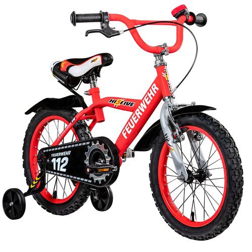 Mit dem schicken 16 Zoll Kinderfahrrad von Hi5 im coolen Polizei- oder Feuerwehr-Design werden Kinderträume wahr! Egal ob Großbrand oder auf Verbrecherjagd - mit diesen Fahrrädern können schon die Kleinsten die Welt retten. Ganz nebenbei können Kinder sicher das Radfahren lernen. Die leichten Kinderräder haben einen stabilen Stahlrahmen, der robust genug für den Kinderalltag ist. Der breite Lenker lässt sich gut halten, die Griffe besitzen zusätzlich einen Flansch gegen Abrutschen. Der Bremshebel kann in der Griffweite auf die Handgröße des Fahrers eingestellt werden. Auf dem gepolsterten Kindersattel lässt es sich bequem radeln. Das Hi5 Kinderrad hat einen Antrieb ohne Gangschaltung, dessen Kette sich hinter einem geschlossenen Kettenschutzkasten aus Kunststoff verbirgt. Dieser Kettenschutz verhindert nicht nur ein Verheddern oder Dreckigwerden der Kleidung, sondern bringt auch passendes Design mit - damit sind sowohl Eltern als auch Fahrer zufrieden. Die Plattformpedale aus Kunststoff bieten dem Fuß viel Halt und sind mit Reflektoren ausgestattet. Zum Verzögern des Rads stehen eine V-Bremse am Vorderrad und eine Rücktrittbremse am Hinterrad zur Verfügung. Schutzbleche an beiden Rädern sorgen dafür, dass dein Kind beim Radfahren nicht dreckiger als unbedingt nötig wird. Die Stützräder können nach Belieben montiert oder abgenommen werden. Hier hast du freie Entscheidung, ob dein Kind mit oder ohne die Stützräder fahren lernt. Die Reifen mit 2,125 Zoll Breite besitzen ein Stollenprofil, mit dem es sich auch abseits asphaltierter Flächen gut fahren lässt. Sie sind auf stabile Stahl-Singlewallfelgen aufgezogen, die ausreichen robust sind und jeden Spaß mitmachen. Wir empfehlen das 16 Zoll Kinderrad für Fahrer mit einer Körpergröße zwischen 105 und 120 cm bzw. einem Alter ab ca. 4 Jahren. Das Rad wird zu 85 % vormontiert ausgeliefert. Vorderrad, Pedale, Sattel und Lenker müssen montiert werden, ehe es losgehen kann. Technische Daten:Hersteller:Hi5Modell:Polizei oder FeuerwehrFarbe:blau (Polizei), rot (Feuerwehr)Gänge:1Laufradgröße:16 ZollRahmen:Hi5 Stahl Cruiser-RahmenGabel:Hi5 Stahl StarrgabelSteuersatz:1"Vorbau:1" SchaftvorbauLenker:Hi5 Stahl BMX-Lenker, Breite: 550 mmGriffe:PVC, PAK-frei, mit FlanschBremshebel:Kunststoff Dreifingertyp, einstellbare GriffweiteKurbelgarnitur:Stahl, einteiligKassette:EinfachritzelBremsen:V-Brake vorne, Rücktrittbremse hintenReifen:16" x 2,125" mit StollenprofilFelgen:Hi5 Stahl SinglewallSpeichen:rostfreier StahlPedale:Kunststoff PlattformpedaleSattel:Hi5 Kindersattel, schaumstoffgepolstertSattelstütze:KerzensattelstützeStützräder:abnehmbarSchutzbleche:KunststoffKettenschutz:Kettenschutzkasten, Kunststoff, mit Designempfohlene Körpergröße:105 - 120 cm / ab ca. 4 JahreSattelhöhe vom Boden:57 - 60 cmLenkerhöhe vom Boden:70 - 73 cmÜberstandshöhe:44 cmzulässiges Gesamtgewicht:30 kgGewicht:11 kgLieferzustand:85 % vormontiert. Lenker, Pedale, Vorderrad und Sattel müssen montiert werdenLieferumfang:1 Fahrrad, Zubehör (Reflektoren, Glocke, Stützräder, Schutzbleche, Kettenschutz, Trinkflasche)