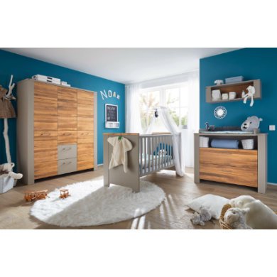 Das Kinderzimmer Tokio überzeugt durch moderne Optik, pflegeleichte Oberflächen, eine komfortable Türdämpfung und Schubladen mit Selbsteinzug. Die Möbel zeichnen sich durch viel Stauraum aus, so dass alles seinen Platz findet. So bietet die Wickelkommode mit dem abnehmbaren Wickelaufsatz, den Sicherungsleisten, einem offenen Fach und den drei Schubladen viel Platz für Wickelzubehör. Technische Details: Made in Germany Garantiert Nachhaltig Kinderbett Farbe: taupe / wildeiche Material Gestell: Spanplatte, melaminbeschichtet Material Leisten und Lattenrost: Buche massiv, geölt Liegefläche: Breite x Länge 70 x 140 cm Maße: Breite x Länge x Höhe 78 x 144 x 93 cm 3-fach verstellbares Rost Seitenteile mit breiten Sprossen Der Korpus hat ABS-Kanten Umbaubar zum Juniorbett Wickelkommode Farbe: taupe / wildeiche Material: Spanplatte, melaminbeschichtet Material Schubladen: Buche massiv, geölt Maße ohne Wickelaufsatz: Breite x Tiefe x Höhe 117 x 45 x 92 cm Maße mit Wickelaufsatz: Breite x Tiefe x Höhe 117 x 71 x 99 cm Wickelfläche: Breite x Tiefe 87 x 71 cm Wickelhöhe: 99 cm Wickelaufsatz abnehmbar 2 Schubladen mit Selbsteinzug Kleiderschrank Farbe: taupe / wildeiche Material: Spanplatte, melaminbeschichtet Material Türen: Buche massiv, geölt Maße: Breite x Tiefe x Höhe 150 x 51 x 194 cm 2 feste Mittelböden 1 Kleiderstange 2 Schubladen mit Selbsteinzug 3 Türen mit Dämpfung 3 Einlegeböden Umbauseiten Farbe: taupe Material: Spanplatte, melaminbeschichtet Maße: Breite x Länge x Höhe 16 x 139 x 2 cm Im Lieferumfang enthalten: Babybett Lattenrost Kommode Wickelaufsatz Kleiderschrank Umbauseiten Achtung: Dekoration und Matratze sind nicht im Lieferumfang enthalten