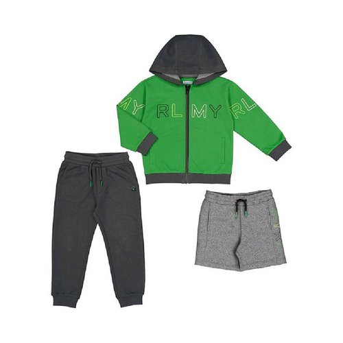 Mayoral Kinder JogginganzugMaterial: Jacke und lange Hose 59% Baumwolle 40% Polyester 1% Elasthan, Shorts 60% Baumwolle 40% Polyester3-teiliger Sportanzug für Jungen aus Sweatmateriallangärmlige Sweatjacke mit KapuzeFrontreißverschluss mit Kinnschutzseitliche EinschubtaschenBuchstabenprint auf der Vorderseite und an den Ärmelnelastische Saumabschlüsselange Hose in dunkelblau und graue Shortsregulierbarer Schlupfbund mit Tunnelzug und Kordelseitliche Einschubtaschen und eine aufgesetzte GesäßtascheDer Mayoral Kinder Jogginganzug ist ein 3-teiliger Komplett-Outfit, bestehend aus einem Hoodie, einer Sweathose und Shorts. Hergestellt aus weichem und bequemem Material, bietet dieser Jogginganzug maximale Bewegungsfreiheit für den täglichen Gebrauch oder das Spielen im Freien.Die Sweatjacke hat eine Kapuze und Bündchen an Ärmeln und Hüfte, die eine perfekte Passform garantieren. Die Sporthose und Shorts sind beide mit einem elastischen Bund ausgestattet, um eine bequeme Passform zu garantieren. Die lange Hose ist ideal für kühlere Tage, während die kurze Hose bequem für den Sommer ist.Dieser Jogginganzug ist einfach zu pflegen und kann bei niedrigen Temperaturen in der Waschmaschine gewaschen werden. Er ist eine großartige Wahl für Kinder, die bequeme Kleidung lieben und dennoch stylish aussehen möchten.Insgesamt ist der Mayoral Kinder Sportanzug ein Outfit, das Kindergartenkinder und Grundschulkinder lieben werden. Mit der Sweatjacke, der Sporthose und den Shorts bietet es eine Vielzahl von Kombinationsmöglichkeiten für jede Jahreszeit und für Sport und Spiel.