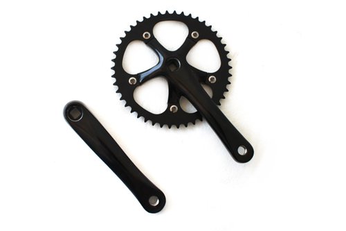 Die Mighty Kurbelgarnitur in Schwarz ist ein hochwertiges Produkt für Fixie- und Singlespeed-Fahrräder. Sie ist kompatibel mit BSA Vierkant-Innenlagern mit einer Länge von 107 oder 111 mm und besteht aus robustem 7075 T6 Aluminium.Das Kettenblatt hat 46 Zähne und der Lochkreisdurchmesser beträgt 130 mm BCD mit 5 Löchern. Mit einem Gewicht von 660 g ist die Kurbelgarnitur leicht und dennoch stabil genug, um den Anforderungen des Radfahrens gerecht zu werden.Im Lieferumfang sind 2 Kurbeln mit Kurbelarmen und Kettenblatt enthalten. Die Mighty Kurbelgarnitur ist eine ausgezeichnete Wahl für alle, die auf der Suche nach einer zuverlässigen und langlebigen Kurbelgarnitur für ihr Fahrrad sind.