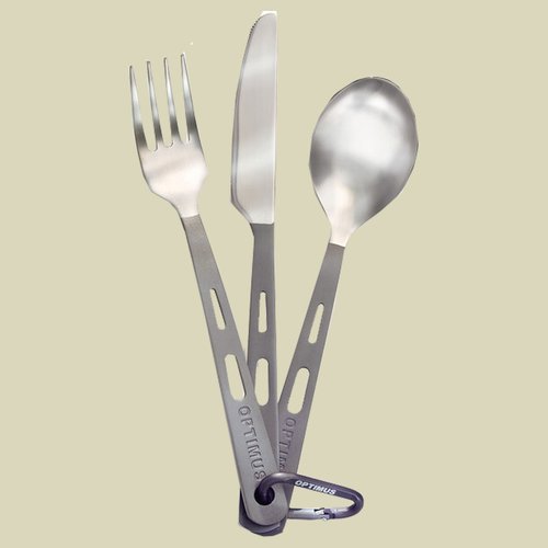 Das Optimus Titan-Besteckset 3-teilig ist ein leichtgewichtiges und robustes Besteckset aus Reintitan, bestehend aus Gabel, Löffel und Messer. Der Griff der Besteckteile ist mattiert und der Besteckkopf ist poliert. Zusammengehalten wird das Set mit einem kleinen Karabiner, so können die Teile an der Ausrüstung oder am Rucksack befestigt werden.