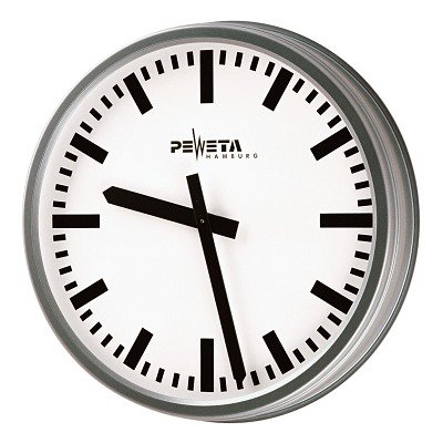 Peweta Funk-Wanduhr – die beständige Uhr für den Außenbereich - Die wetterfeste Peweta Funk-Wanduhr ist durch ihre Robustheit sowohl im Außen- als auch im Innenbereich einsetzbar. Sie muss nicht von Hand eingestellt werden, da sie vom Zeitzeichensender DCF77 in Mainflingen synchronisiert wird. Die Wanduhr kommt mit einem 5 m langem Anschlusskabel, sodass kein Batterieaustausch notwendig ist. Durch das deutliche Metallzifferblatt und die schwarzen, arabischen Zahlen ist die Zeit auch bis zu 50 m noch gut ablesbar. - Funkuhr DCF77 - Synchronisiert vom Zeitzeichensender DCF77 in Mainflingen stimmt die Uhrzeit immer sekundengenau. Die Zeiteinstellung und Sommer-/Winterzeitumstellung erfolgen vollautomatisch. Bei Stromausfall bleiben die Uhren stehen, bei Stromwiederkehr stellen sich die Uhren wieder selbsttätig auf die aktuelle Uhrzeit ein. - Lieferumfang - Im Lieferumfang ist eine abgesetzte DCF77-Antenne (Schutzart IP 68) inkl. 5 m Anschlusskabel enthalten. Durch die separate Montage und Ausrichtung der DCF77-Antenne erhalten Sie stets optimale Empfangsbedingungen. - Gehäuse: - Tiefe: ca. 8,3 cm - Witterungsbeständig - Anthrazit Graumetallic (Eisenglimmer DB 703) - Schutzart IP 54 (EN 60 529) - Vollständiger Berührungsschutz - Schutz gegen Staubablagerungen im Inneren - Geschützt gegen Spritzwasser aus beliebigem Winkel - Feuchtigkeits- und staubgeschützt - Zifferblatt: - Sehr deutliches Metallzifferblatt - Druckdurchmesser 42 cm - Auch aus größerer Entfernung zweifelsfrei ablesbar - Sichtweite: ca. 25-50 m bei mittleren bis günstigen Tageslichtverhältnissen - Weiß lackiert - Mit schwarzen, arabischen Zahlen oder DIN-Balken - Zeiger: - Schwarze Balkenanzeige für Stunden- und Minutenanzeige - Nach DIN 41 092 - Ballwurfsichere Ausführung (optional): - Für den Einsatz auf Schulhöfen und Sportplätzen geeignet - Robustes Gehäuse mit aushebelsicherer 3-Punkt-Befestigung - Mit 2-Scheiben-Verbundsicherheitsglas, 6 mm