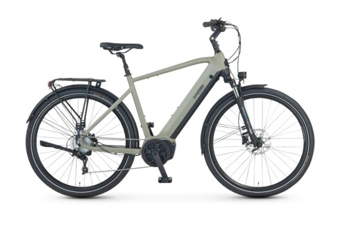 Mit dem Prophete Entdecker 4.0 Trekking E-Bike 28“ machst du dich entspannt auch auf längere Touren und kommst komfortabel ans Ziel. Dafür sorgen die Features des neu designten E-Bikes fast von alleine. Du erhältst dank des Drehmomentsensors im 36 Volt Mittelmotor immer die passende Unterstützung, passend zur aufgewendeten Trittkraft. Die 250 Watt Leistung und das maximale Drehmoment des Motors, das bei 70 Nm liegt, werden vom vollständig in den Rahmen integrierten 15 Ah (540 Wh) Lithium-Ionen Akku mit Energie versorgt. Reichweiten von bis zu 170 km sind also, je nach Fahrweise und Untergrund, möglich. Ein echter Pluspunkt ist, dass das Rahmendesign trotz des großen Akkus optisch nicht zu massig ausfällt. Häng dir für deine Ausfahrten Packtaschen an den strebenlosen Gepäckträger und nimm alles mit, was du für deinen Trip benötigst. Da der Schwerpunkt des Entdecker 4.0 eher im Unterrohr und im Mittelmotor zu finden ist, kannst du mit einer Tasche auf dem Gepäckträger sehr gut die Balance halten. Als Komfortfaktoren findet sich die einstellbare Suntour NEX e25 Federgabel am Vorderrad und die gefederte Patentsattelstütze unter dem Prophete Memory Foam Sattel. Ein winkelverstellbarer A-Head Vorbau und der Trekkinglenker mit geschraubten Ergogriffen komplettiert das Komfortpaket. An den Griffen findest du zwei Bremshebel, mit denen du entspannt die kraftvollen hydraulischen Scheibenbremsen bedienen kannst. Das Model mit Diamantrahmen hat eine Rahmenhöhe von 54 cm und bietet, dank seiner Rahmenarchitektur, perfekte Kraftübertragung. Die Microshift XLE 10-Gang Kettenschaltung sorgt parallel dazu für eine große Bandbreite an Übersetzungen für jedes Streckenprofil. Damit du während der Fahrt sehen kannst, was sich vor dir befindet und gleichermaßen gesehen wirst, hast du einen 90 LUX LED-Scheinwerfer und ein Rücklicht von Prophete mit Bremslichtfunktion am Entdecker 4.0 verbaut. Du bedienst die Beleuchtung am vollfarbigen TFT-Multifunktionsdisplay mit USB-C-Hub und Remote Bedieneinheit. Auch die Anschiebehilfe betätigst du hier, wenn ein Anstieg mal zu steil ist und du absteigen musst, um anzuschieben.