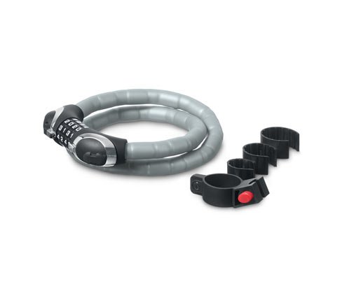 LED-Panzerkabelschloss Farbe: [Grau] Material: [Gehäuse 100% Acrylonitril-Butadien-Styren-Copolymere Schloss Stahl, Metalldraht, Kunststoffbeschichtung, Plastik-Überzug] Maße: [Länge ca. 90 cm Ø ca. 18 mm Ø Fahrradhalterung ca. 20 mm] Inhalt / Zubehör: [Inkl. LED-Licht, Batterie (CR2032), Fahrradhalterung mit 3 unterschiedlich großen Gummiringen und Gebrauchsanweisung ] Gewicht: [Ca. 580 g] Batterie-/Akkulaufzeit: [Leuchtdauer mit 1 Batterie ca. 100 Stunden] Technische Details: [Batterien für das LED-Licht: 3 V, 210 mAh, 0,63 Wh, Einbrennzeit von etwa 10 Sekunden] Mit 4-stelligem Zahlencode|Schloss dank LED auch bei Dunkelheit einfach zu entsperren |Robust und flexibel|Wetterbeständige Kunststoffummantelung schützt das Fahrrad vor Kratzern|Individuelles Erstellen einer 4-stelligen Nummernkombinationen von 0000 bis 9999|Geeignet für Fahrräder, Motorräder oder -roller etc.