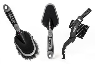 kit mit 3 muc off bursten zum reinigen ihres v lo in jeder ecke und jedem winkel eigenschaften 55 mm pinsel mit seidigem finish um den rahmen ihres v lo die komponenten und gerate zu reinigen wahrend diese teile gepflegt werden und um schwierige oberflachen zu erreichen 35 mm burste ideal zum reinigen von naben kleinen aussparungen im rahmen gabel und aufhangeosen klauenformige burste mit spezieller textur und nylonborsten ideal fur kassetten ketten und getriebe