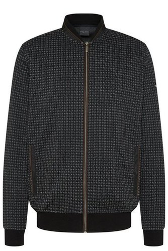 Sweatshirt Jacke mit Collegekragen und einem Jacquard Muster all over. Das Modell hat Nylon Details am Kragen und an den Taschen und eine bugatti Metallplakette auf dem Ärmel