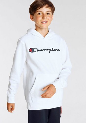 Hauptsache bewegen! Dein Kind spielt gerne Ball oder fährt gerne Rad? Das Sweatshirt »Classic Hooded Sweatshirt large Logo - für Kinder« von Champion könnte ihm dann gut gefallen. Das Sweatshirt aus Baumwollmischung ist sehr angenehm zu tragen. Bequemes Shirt zum Sport Damit Sport und Turnen noch mehr Freude macht, kombiniere elastische Sport-Shorts zum Sweatshirt. Mit gut sitzenden Laufschuhen ist das Outfit perfekt. Das Sweatshirt »Classic Hooded Sweatshirt large Logo - für Kinder« von Champion begleitet dein Kind zum Sporttraining