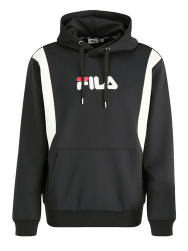Dunkelgrau/Schwarzer Kapuzenpullover in regulärer Passform. Fila Logo Print auf der Brust. 91% Polyester, 9% Elasthan. Das Model ist 186 cm und trägt Größe M.