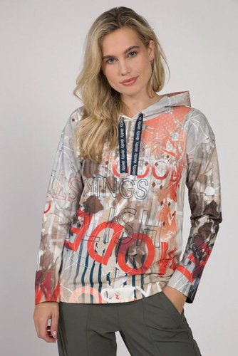 Hoodie Identity mit modernem Allover Print und Statement aus Glitzersteinchen. Kapuze mit Identity Bindeband, überschnittene Schultern, Langarm.