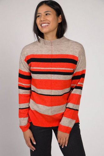 Pullover aus weichem Feinstrick mit modernen Ringeln. Gerader Schnitt mit Stehkragen und Ziernaht vorne. Langarm, Seitenschlitze, Rippbündchen.
