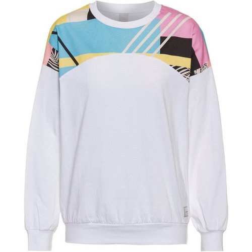 Sweatshirt mit grafischen Elementen und Colourblock-Details im Schulterbereich; Rundhalsausschnitt; überschnittene Schultern; Abschlüsse mit Rippbündchen; aus veganen, nachhaltigen Materialien hergestellt; Fair Wear-Produkt; Material 100% Baumwolle.