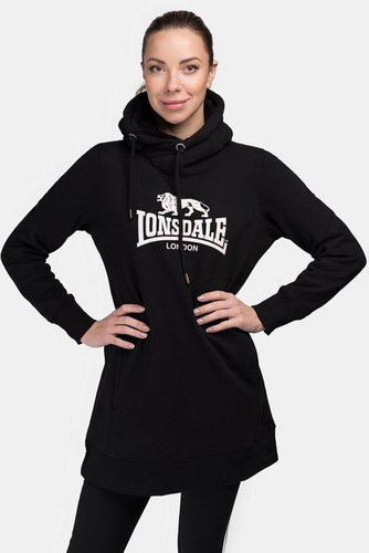 Cooles Sweatkleid von Lonsdale für Damen in legerer Passform. Die hochgeschnittene Kapuze mit Kordelzug, das gedruckte Markenlogo und die aufgesetzte Kängurutasche verleihen dem Kleid eine gewisse Lässigkeit. Kombiniere den Longpullover einfach mit Leggins oder Jeans und Boots oder Sneakern - perfekt für gemütliche Tage!