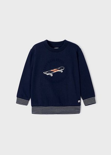Das marineblaue Sweatshirt mit Motivdruck vorn ist aus weichem Sweatstoff und locker geschnitten. Die Bündchen am Ärmel und Bund sind blau-weiß gestreift.