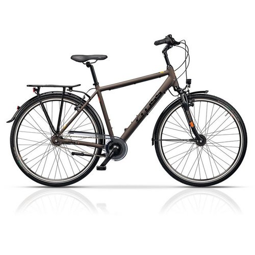 28 ZOLL HERREN CITY FARRAD CITERRA GENT CITYBIKE SHIMANO NEXUS 7 GANG Du bist auf der Suche nach einem klassischen Citybike? Hier bist du mit dem Airtracks CITERRA GENT richtig. Dank der robusten und wartungsarmen Shimano Nexus 7-Gang-Nabenschaltung und Axa Beleuchtungsanlage betrieben durch den Nabendynamo Shimano Nexus, fährt die Funktionalität immer mit.Das CITERRA GENT sorgt mit seiner aufrechten Sitzposition neben entspanntem Radeln vor allem für mehr Übersicht und damit für zusätzliche Sicherheit im Straßenverkehr. Der Vorbau ist winkeleinstellbar, somit kannst du die Sitzposition nach deinen Wünschen gestalten. Zu der Grundausstattung eines Cityrades gehören auch Schutzbleche und Gepäckträger. Diese sind von renommierten deutschen Herstellern, also SKS und Racktime (Tochterfirme von Tubus). Der Gepäckträger von Racktime ECO 2.0 bietet dir eine Vielfalt an Befestigungsmöglichkeiten für dein Gepäck, da dank Snapit-System jede Menge Racktime-Zubehör darauf passt. Nicht nur alleine durch das Fahrradfahren denkst du Grün. In diesem Cityrad gibt es noch etwas Grünes und nämlich die Bereifung. Bei den Schwalbe Road Cruiser ist der Gummi der Lauffläche gefertigt mit Polymeren ausschließlich aus nachwachsenden und recycelten Rohstoffen. Das Fahrrad ist auch als Damen-Variante verfügbar, sodass du immer mit deinem Lieblingsmensch in Bewegung werden kannst! Schau dir dafür einfach unser Modell CITERRA GENT an. Dieses Fahrrad wird zu 92 % fertig montiert geliefert. Es müssen lediglich Lenker, Vorderrad und Pedale fixiert werden. Die fahrfertige Endmontage ist von einer fachkundigen Person durchzuführen. Größen Empfehlung Rahmengröße 48 cm Körpergröße 155-165 cm Rahmengröße 52 cm Körpergröße 165-175 cm Rahmengröße 56 cm Körpergröße 175-185 cm Rahmengröße 60 cm Körpergröße 185-195 cm FAHRRAD SPEZIFIKATIONEN: RahmenmaterialAluminiumGabelSuntour SF13-CR7V, 50mm FederwegSteuersatzSemi-integriert 1 1/8",KurbelSuntour, 170mm, 38 Zähne, KettenschutzTretlagerVierkant Patronenlager, 118mmPedaleVP-809, Kunststoffkörper, ReflektoreKetteKMC Z6, 1/2", x 3/32",Ritzel19 ZähneGetriebenabeShimano SG-C3001, 7-Gang NabenschaltungSchalthebelShimano SL-C3000-7BremshebelPromax BL-46APBremse VRPromax TX115C V-BremseBremse HRPromax TX115C V-Bremse, RücktrittbremseFelgenHohlkammer, 36 Löcher, ETRTO 622x21Nabe VRShimano Nexus DH-C3000 NabendynamoReifenSchwalbe Road Cruiser 42-622, schwarz-cremeSattelSelle Royal Nuvola ManLenkergriffeHerrmans DD37BL, 120mm, mit LockschellenVorbauAluminium, 90mm, 25,4mm, neigungsverstellbarLenkerAluminium, 590mm, Ø25,4mm, Rise: 26mm, Sweep: 33°SattelstützeAluminium, 300mm, Ø27,2mmSchutzblecheSKS PET-A46GepäckträgerRacktime ECO 2.0FrontleuchteAxa Ecoline 15 LuxRückleuchteAxa Blueline, mit StandlichtStänderUsrsus Easy Central, längenverstellbarGewicht in kg. (ca.)17,10 kg