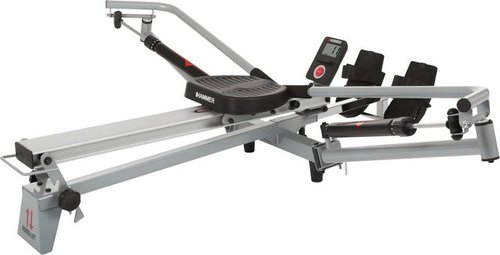 Das klassische Rudergerät von Hammer ist mit Auslegerarmen und 3-fach höhenverstellbarer Alu-Ruderschiene perfekt für ein intensives Rudertraining geeignet. Durch das Rudertraining werden alle Strukturen des Körpers, sowohl die aktiven als auch die passiven gestärkt. Die Hauptarbeit liegt beim Latissimus dorsi, dem breiten Rückenmuskel, dem Bizeps und der Oberschenkelmuskulatur. Aber auch der untere Rücken und die Bauchmuskulatur sind aktiviert und leisten wertvolle Stabilisationsarbeit. Wadenmuskulatur und Gesäß sind hauptsächlich bei der Streckbewegung involviert. Bei geeigneter Bewegungsausführung ist bereits nach einer relativ kurzen Trainingsperiode ein Kräftigungseffekt und Muskelaufbau spürbar. Primär gilt die Rudermaschine jedoch als Cardiotrainer, d.h. Ausdauergerät. Beim Rudern lastet das Körpergewicht auf dem beweglichen Rollsitz. Die Knochen, Bänder und Sehnen der Beine werden dadurch entlastet und der trainierenden Person ein gelenkschonendes Training ermöglicht. Da beide Ruderarme möglichst gleichmäßig bewegt werden sollten, wird auch die Koordination mit dem Rower Cobra intensiv geschult. Der Bordcomputer stellt auf seinem übersichtlichen LCD-Display alle trainingsrelevanten Daten dar. Da der Computer während der gesamten Ruderbewegung mit dem Sitz mitfährt, ist das Ablesen der Trainingsdaten auch bei schnelleren Trainingssequenzen kein Problem. Dieses patentierte Computersystem macht das Training mit dem Rudergerät besonders angenehm. Viele wertvolle Effekte auf das Herz-Kreislaufsystem können durch gezieltes Training erreicht werden: Verbesserung der allgemeinen Ausdauer und Kondition, Verbesserung der Kurz-, Mittel- und Langstreckenausdauer, Unterstützung des Herz-Kreislaufsystems, spezieller Aufbau der Rücken-, Arm-, Schulter- und Beinmuskulatur, Reduktion des Körpergewichts und Verringerung des Unterhautfettgewebes.