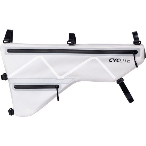 **Die große Cyclite Rahmentasche für zentral und aerodynamisch platziertes Gepäck, die Platz für eine Flasche lässt. Ultra-leicht. Robust. 100% Wetterfest.** Die Frame Bag Large / 01 ist eine große Rahmentasche. Sie verfügt über mit ihrem großen Stauvolumen über viel Platz für zentral und aerodynamisch platziertes Gepäck (unter Anderem Werkzeug, Trinkblase, Powerbank, Schloss), auf das tagsüber zugegriffen wird. Bei der Konstruktion wurde Wert darauf gelegt, dass auch bei kleinerer Rahmengröße, neben Frame Bag Large / 01 noch eine Trinkflasche Platz im Rahmendreieck findet. Die Frame Bag Large / 01 ist trotz des großen Volumens und der diversen Features extrem leicht und damit perfekt geeignet für längere Abenteuer oder Ultra-Distanzrennen. Die Frame Bag Large setzt einen gewissen Freiraum unterhalb des Oberrohrs voraus, der bei sehr kleinen Rahmen eventuell nicht gegeben ist. Der Abstand Steuer- zu Sattelrohr muss mindestens 44 cm betragen. **Ultra-leicht:** Spare Energie, komme weiter, behalte die Dynamik Deines Rads und maximiere Dein Fahrerlebnis. **Wetterfest, langlebig und leicht zu reinigen** Fahre bei jedem Wetter, schütze Deine Wertsachen und halte Dein Gepäck trocken. Taschen von CYCLITE sind Hochfrequenz-verschweißt und bestehen aus hochwertigem, starkem und dennoch leichtem Gewebe, das auf beiden Seiten beschichtet ist, um maximale Robustheit und Reinigungsfähigkeit zu gewährleisten. **3,6 l Volumen und voller Funktionen** Die Tasche ist in zwei große Fächer, oben und unten unterteilt, hat ein weiteres Seitenfach für Kreditkarten, Ausweis oder Bargeld, zwei Netz-Innentaschen für Kleinteile sowie einen Schlüsselhaken. An der Vorderseite der Tasche findet sich eine abgedeckte Öffnung für die Durchführung von Stromkabeln oder einem Trinkschlauch. Die Trennung zwischen den beiden Hauptfächern (oben und unten) kann per Klett herausgenommen werden, wodurch ein einziges großes Fach entsteht. **Plastikfreie Verpackung** Als Radfahrer, die die Natur lieben, macht Cyclite alles, um ihren Fußabdruck zu minimieren - deshalb wird Plastikmüll vermieden.