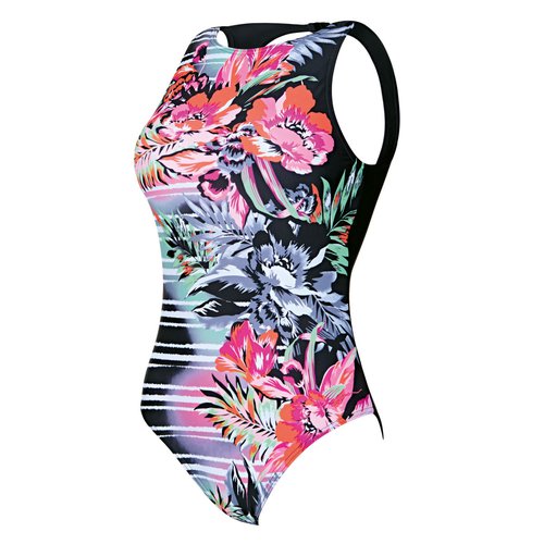 Dieser bunte, schicke Badeanzug ist ein echtes Muss für jede Schwimmgarderobe. Er verfügt über eine hochgeschlossene, elegante Vorderseite, einen offenen Rücken mit Clip, zudem machen großflächige Details vorne den Anzug zu einem echten Hingucker.