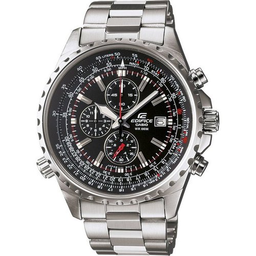 ÜberblickNeo-DisplayRechenschieberWasserdichtigkeit: 10 ATMBeschreibungDas Edelstahldesign dieser Uhr der Marke Casio Edifice Classic verleiht Ihrem Handgelenk eine elegante Note. Hart, robust und elegant: Ihre vielfältigen Funktionen werden Sie begeistern. Zu den herausragenden Merkmalen zählen ein Sicherheitsverschluss, der ein versehentliches Öffnen des Armbandes verhindert, sowie das harte, kratzfeste Mineralglas. Dank ihrer Wasserdichtigkeit bis zu einer Tiefe von 100 Metern eignet sich diese Uhr zudem perfekt für den TauchsportEigenschaftenNeo-Display: Zeiger und Indizes sind fluoreszierend beschichtet und leuchten in der Dunkelheit nach. · Datumsanzeige · Stoppuhr: 1/20 Sekunde bis 12 Stunden: Durch einfachen Knopfdruck wird die Zeitmessung mit einer Genauigkeit von Zwanzigstelsekunden durchgeführt. · Rechenschieberfunktion: Mit der Rechenschieberfunktion können unterschiedliche Berechnungen erstellt werden, wie z. B. Flugstrecke, Geschwindigkeit oder Kraftstoffverbrauch. · Verschraubter Gehäuseboden: Das Innenleben der Uhr ist optimal gesichert. · Verschraubte Krone · Die Batterielebensdauer beträgt 2 Jahre