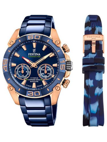 Marke: FestinaArtikelnummer: F20549/1Modellname: Special Edition Hybrid Smartwatch Chrono BikeAnzeige: ChronographUhrglas: SaphirglasUhrband: EdelstahlUhrbandbreite: 22 mmUhrbandfarbe: blauUhrbandoberfläche: mattiert &, glänzendmaximaler Armumfang: 22 cmminimaler Armumfang: 15 cm ( der Innendurchmesser der Uhr kann stufenweise bis auf diesem Wert verkleinert werden )Zifferblattfarbe: blauGehäuse Material: EdelstahlGehäuseoberfläche: mattiert &, glänzendGehäuse Höhe: 14,6 mmGehäuse Durchmesser: 45 mmGewicht der Uhr: 200 grammWasserdichtheit: 10 barFunktionen: DatumDas Gehäuse der Uhr ist rosé vergoldet.Gefilterte BenachrichtigungenVerpassen Sie nie, was wichtig istKamera-FernsteuerungFür das perfekte BildMusiksteuerungMusik auf KnopfdruckIf This Then ThatPlanen Sie Aktionen basierend auf Ihren täglichen BedürfnissenGet movingZeit sich zu bewegenDaily HundredJeder Schritt zähltAktivitätszielSetzen Sie sich selbst HerausforderungenStoppuhrAuf die Plätze, fertig, los!Die APP:Kompatibel mit Android und iPhoneÜbersichtlich und intuitivEinfach zu bedienenMinimalistisches DesignSchnell und effizientDie Uhr wird mit einem zusätzlichem Kautschuk Uhrband in Camoflage Optik (grau-schwarz-hellgrau) in einer Special Edition Verpackung geliefert.
