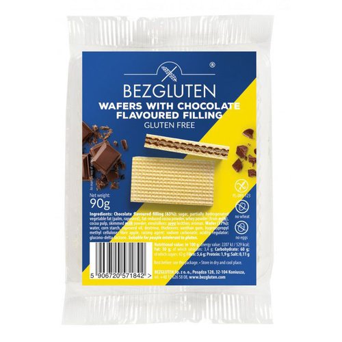 Produktbeschreibung Glutenfreie Waffeln gefüllt mit Schokocreme. Passt immer und zu jeder Zeit. Allergen-Information Glutenfrei, Erdnussfrei, Weizenfrei, Sesamfrei, Lupinenfrei, Schalenfruchtfrei, Senffrei, Selleriefrei, Hefefrei, Eifrei Allergene Milchbestandteile, Soja Produktinformation Vegetarisch Inverkehrbringer: Bezgluten Sp. z o.o., PosÄ…dza 128, Pl-32-104 Koniusza Aufbewahrung: An einem trockenen, kühlen und lichtgeschützten Ort aufbewahren. Mindestens Haltbar Bis: siehe Verpackungsaufdruck Zutaten Waffeln (37%): Wasser, Maisstärke, Maismehl, Rapsöl, Dextrose, Verdickungsmittel: Guarkernmehl, E 464; Ballaststoffe, Backtriebmittel: Natriumcarbonat; Säureregulator: E 575; Salz. Schokoladenfüllung (63%): Zucker, teilweise hydriertes Pflanzenöl (Palm, Raps), fettreduzierte Kakaopulver, Molkenpulver , Kakaomasse, Magermilchpulver , Emulgator: Sojalecithin , Aromen. Nã'Hrwertangaben PRO 100g 2207 kJ / 529 kcal Fett 30,0 g   davon gesättigte Fettsäuren 3,4 g Kohlenhydrate 60,0 g   davon Zucker 42,0 g Ballaststoffe 5,6 g Eiweiß 1,9 g Salz 0,11 g . Rechtlicher Hinweis: Wir pflegen die spezifischen Angaben der Produkte mit großer Sorgfalt. Dennoch können wir dabei vereinzelte Fehler nicht ausschließen, weshalb wir Sie bitten, die Produktangaben immer noch einmal mit dem Etikett des jeweiligen Produktes zu vergleichen.