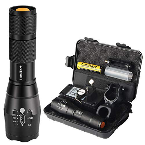 EXTREM HELL & 5 Modi: Lumitact G700 führt taktische Taschenlampe verwendet einen High-Efficiency Cree LED L2-Chip, mit einem guten Design PCB und Galvanisieren Aluminium Light Cup, maximal kann 3000 Lumen sein! Der Lichtstrahl kann bis zum 200 m geschossen werden. Bietet fünf adaptive Einstellungen: Hoch / Mittel / Niedrig / Eco / SOS. Zoom / Fokus-Funktion durch Verschieben / Drehen des Kopfes\nSchnelles Laden und leistungsstarker Akku: Bis zu vier Stunden Lichtdurchlässigkeit (bei mittlerer Einstellung) mit dem mitgelieferten 2600-mAh-Akku. Mit dem hochwertigen Ladegerät ist der Akku in nur 4 Stunden vollständig aufgeladen.\nLANGLEBIG & VERLÄSSLICH: Trotz stark Regen da IP65 wasserfest. Der robuste Aluminiumkörper und schockfeste Aufbau vertragen harten Umgang. Verwenden Sie es beim Jagen, Wandern, Radfahren und so weiter.\nPRAKTISCH: Kompakt, um leicht in Ihre Tasche zu passen egal, wohin Sie gehen. Die Oberfläche ist so gestaltet, dass diese Taschenlampe nicht aus Ihrer Hand rutscht. Stellen Sie die Taschenlampe senkrecht auf, um sie als Notfalllicht zu nutzen. Laden Sie diese Taschenlampe innerhalb von 4 Stunden über 18650 Ladegerät inbegriffen\nWas Sie erhalten: Lumitact G700 Taschenlampen mit einer Schlüsselanhänger Lampe, 18650 wiederaufladbare Li-Batterie, Ladegerät, 18650 Akku-Röhre und AAA-Akku-Halter, Taschenlampe Holster, Benutzerhandbuch, Geschenk-Box.
