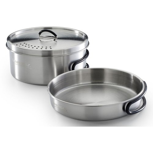 Leichtes und kompaktes Edelstahl-Kochset mit praktischen Silikongriffen – ideal für Trekking und Camping.