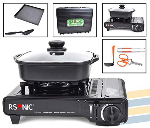 RSonic - TruWare Campingkocher Gaskocher Mega Set | BBQ Grillpfanne + Kochtopf + Kochgeschirr (Mega Set + 8 Kartuschen)
