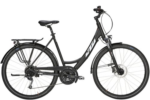 KTM Avenza 27 Disc Das AVENZA 27 DISC von KTM ist ein komfortables Trekkingrad , welches sich dank hochwertiger Ausstattung und hervorragender Verarbeitung als perfekter Begleiter im Alltag eignet. Mit dem verstellbaren Lenkervorbau können Sie jederzeit Ihre bevorzugte Sitzposition einstellen und somit ein Plus an Fahrkomfort auf längeren Strecken gewinnen. Der tiefe Durchstieg bietet Ihnen zudem einen bequemen Auf- und Abstieg, sowie viel Bewegungsfreiraum. Die SR Suntour SF16-NEX HLO Federgabel mit Lockout-Funktion und 63 Millimetern Federweg mildert Unebenheiten wie Kopfsteinpflaster, Schotterpisten und kleine Schlaglöcher sanft ab. Das Shimano Deore Schaltwerk mit einer 27-Gang Kettenschaltung bietet eine optimale Schaltperformance, während die hydraulischen MT200 Scheibenbremsen von Shimano für eine zuverlässige Bremsleistung sorgen. Die Schwalbe Marathon Bereifung mit Pannenschutz sorgt für den nötigen Grip und Traktion auf asphaltierten Strecken und im Gelände. Am leichten aber stabilen Gepäckträger mit i-Rack-Systemaufnahme und Federklappe, welcher am Rahmen verschraubt ist und mit bis zu 25 Kilogramm belastet werden kann, können spielend leicht weitere Körbe und Taschen angebracht werden. Die helle Fuxon LED-Lichtanlage mit Tagfahrlicht und Standlicht erhöht Ihre Sichtbarkeit im Straßenverkehr und lässt Sie garantiert nicht im Dunkeln stehen. ✓ Shimano 27-Gang Kettenschaltung ✓ SR-Suntour Federgabel mit Lockout-Funktion ✓ Max. Systemgewicht von bis zu 136 kg (Fahrer inkl. Fahrrad u. Gepäck) ✓ Hydraulische Scheibenbremsen Produktdetails Marke: KTM Radgröße: 28 Zoll Farbe: schwarz-matt Ständer: KTM Alu Light Hinterbauständer, in der Länge verstellbar Rahmen: Aluminium 6061 Gabel: Suntour SF16-NEX HLO, 700C, Fw: 63 mm, hydraulisches Lockout Dynamo: Shimano 3D37 Centerlock, Nabendynamo 6V-3W Scheinwerfer: Fuxon F-170 DRL - 70 LUX LED-Scheinwerfer mit Sensor u. Tagfahrlicht Rücklicht: Fuxon R-99 flaches Toplight mit LED-Standlicht Gepäckträger: KTM light Carry-more / I-RACK Systeme Kettenschutz: Horn Catena 16/48, Kettenschutz Lenker: KTM Line HB-KT2, Trekking 31.8, - 640 mm // Ergon Grip ergonomisch Vorbau: KTM Line AS820, A-Head 17° 31.8,Neigung verstellbar, (H 110 /D 90) Bremsen: Shimano MT200 Disc-hydr., Ø 180/160 mm Laufrad: Ryde Rival Disc 700C, geöst Umwerfer: Shimano Altus M370 Kurbelgarnitur: Shimano Alivio T4010 48-36-26, mit Schutzring (Shimano Logo) Schalthebel: Shimano Altus M2010 Rapidfire 3/9mit Ganganzeige Schaltwerk: Shimano Deore M591 Cassette: Shimano HG201-9 11-34 Zahnkranzkassette, silber Sattel: Selle Royal Rio (Damen / Herren) Sattelstütze: KTM Line SP-612 N 300/27.2 Systemgewicht: bis zu 133 kg Pedale: VP 608, Alu Trekking Pedal, Antirutschbelag Innenlager: Shimano ES300 Oktalink Gewicht: ca. 17,2 kg (ohne Pedalen) Schutzblech: SKS Pet-A46R Bereifung: Schwalbe Marathon 40-622 (Pannenschutz) Modelljahr: 2021 Änderungen und Irrtümer vorbehalten.