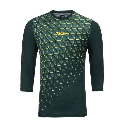 Oakley Flow 3/4 Jersey bequem geschnittenes Mountainbike-Trikot mit 3/4-Arm grafischer Print auf Vorderseite und Rücken recyceltes Polyester-Material mit 4-Wege-Stretch Hydrolix-Streifen am Halsausschnitt leitet Feuchtigkeit effektiv ab unauffällige Tasche mit seitlichem Zugriff verlängerter Rücken mit reflektierendem Print CiCLO-Behandlung macht Kunststofffasern nach der Entsorgung leichter zersetzbar und die Kleidung umweltfreundlicher 95% Polyester, 5% Elasthan