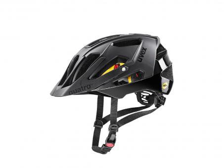 Dazu ist er in dieser Version mit dem MIPS-System ausgestattet, welches bei einem Sturz den entstehenden Rotationskräften entgegenwirkt., monomatic Verschluss, anatomic IAS, Details, FAS Gurtband-System, Kamera Adapter (optional nachrüstbar), Robust und schlagfest, bietet dir die Double Inmould Konstruktion höchstmögliche Sicherheit auf dem Trail., 17 Luftkanäle, Rundum passgenau einstellbar und mit einem verstellbaren Visier überzeugt der Uvex Quatro cc MIPS auf jedem Trail., Multi Impact Protection System (MIPS), basic pads, verstellbares Visier, Eine top Ausstattung und eine hochwertige Verarbeitung - made in Germany - zeichnen den Uvex Quatro aus., Ein matter All-Mountain-Fahrradhelm mit Multi Impact Protection System: Der Uvex Quatro cc MIPS, Und die 17 integrierten Ventilationsöffnungen sorgen für ein angenehmes Kopfklima auf der Tour., Insektengitter, Double Inmould Technologie
